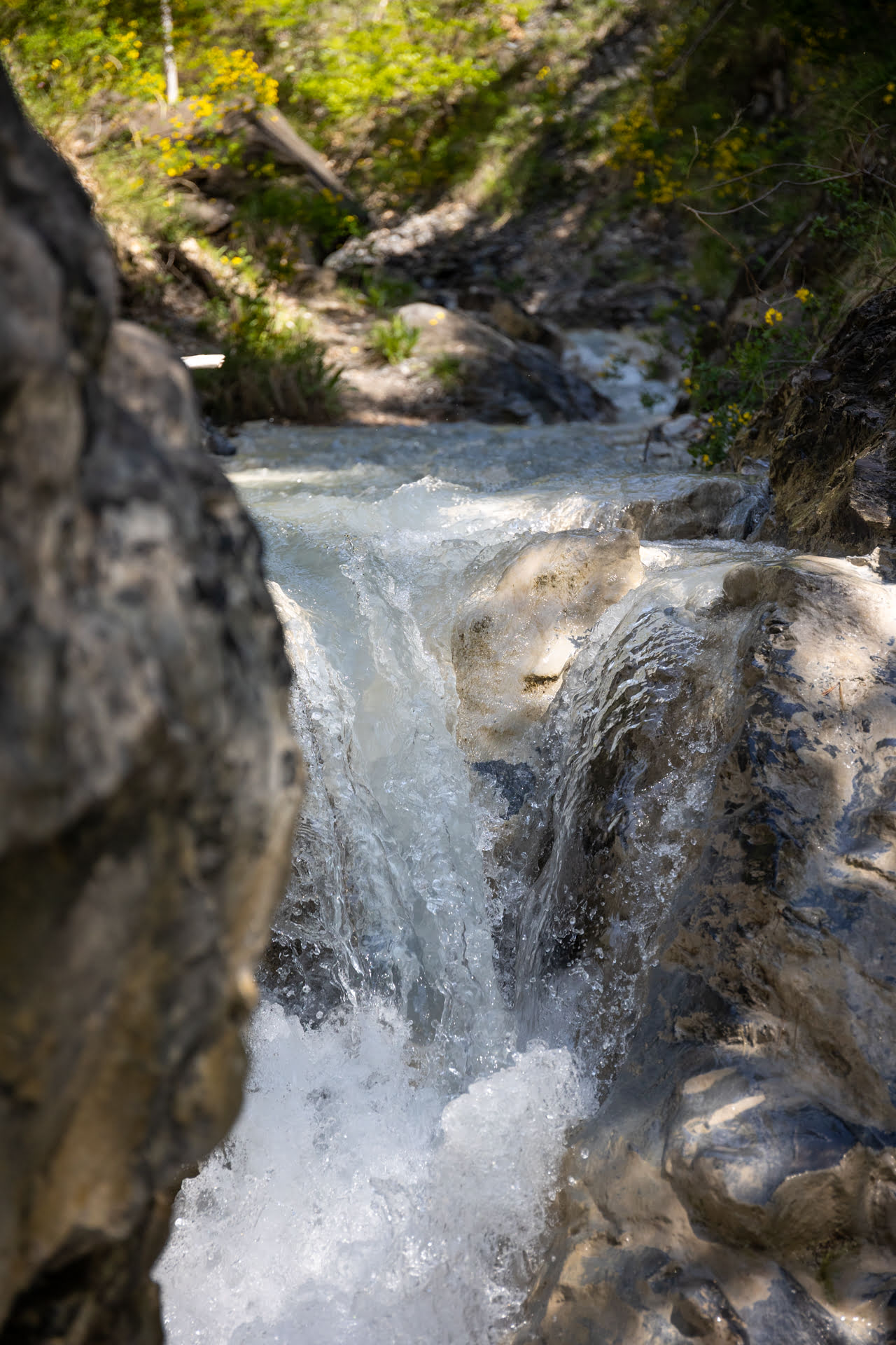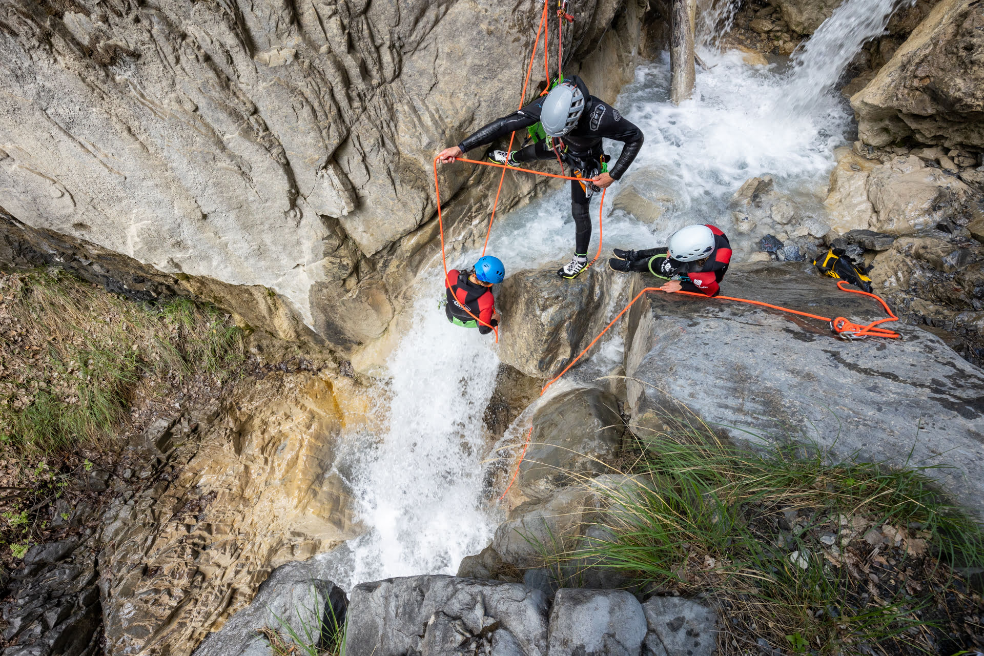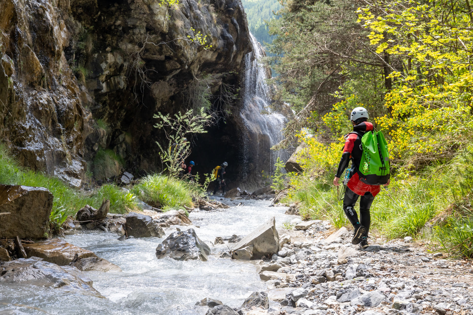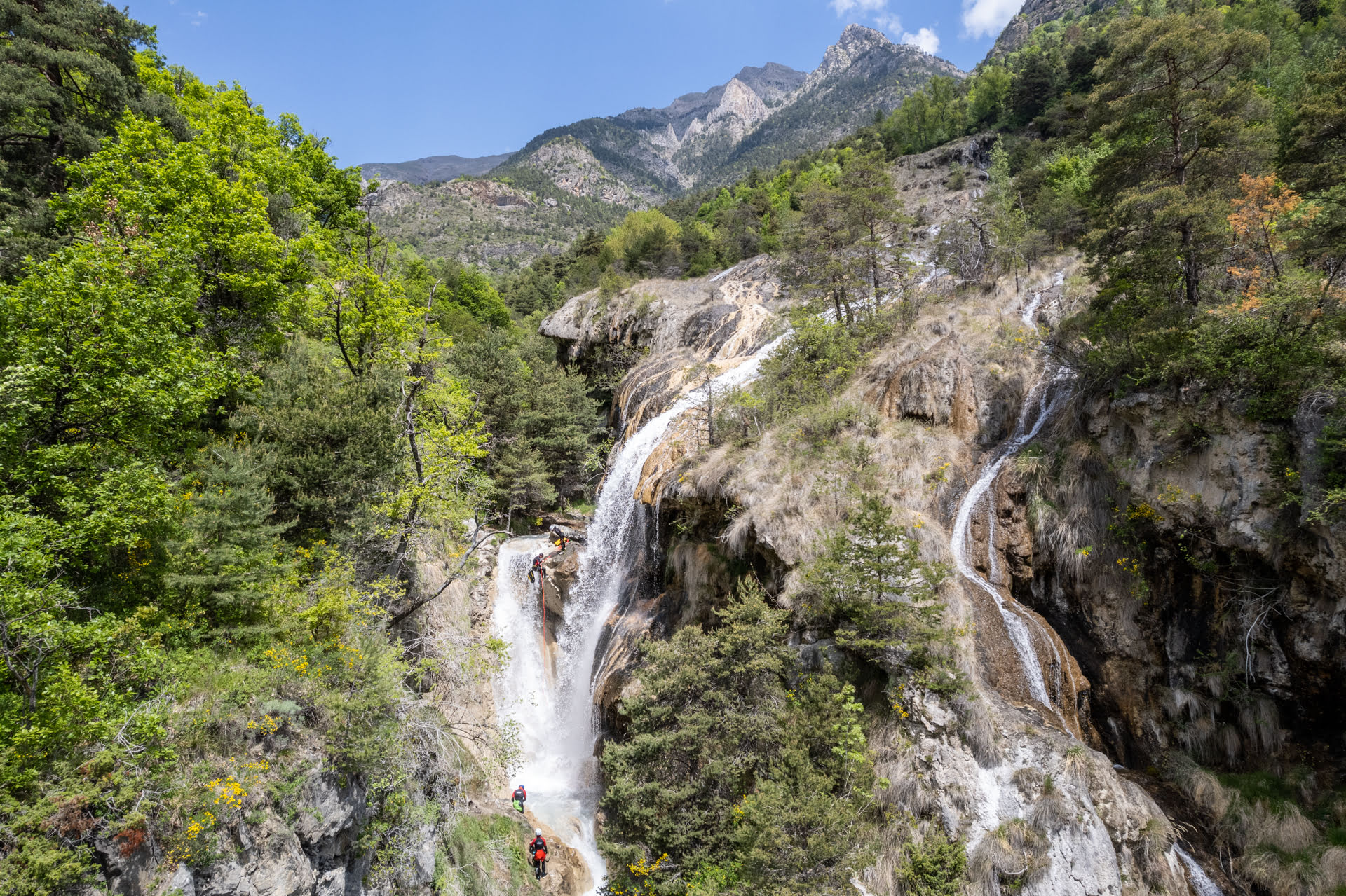Après avoir garé les véhicules à l’aval du canyon, nous entamerons une marche d’approche d’environ 15 à 20 minutes en fonction du groupe. Ce sentier nous mènera à un point de vue saisissant : d’un côté, point clef de notre itinéraire, trois cascades se déversant dans le cours d’eau que nous nous apprêtons à descendre ; derrière nous, le panorama s’ouvre sur la vallée de l’Ubaye.