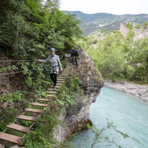 Le premier socle vertical nous mène à une première terrasse dont la vue s’ouvre sur la gorge, découvrant un paysage de roche plissée comme un accordéon, et un immense pont suspendu qui nous regarde de haut. L’itinéraire navigue à flanc de falaise, pour enfin rejoindre la partie sommitale juste à côté de la conduite forcée.