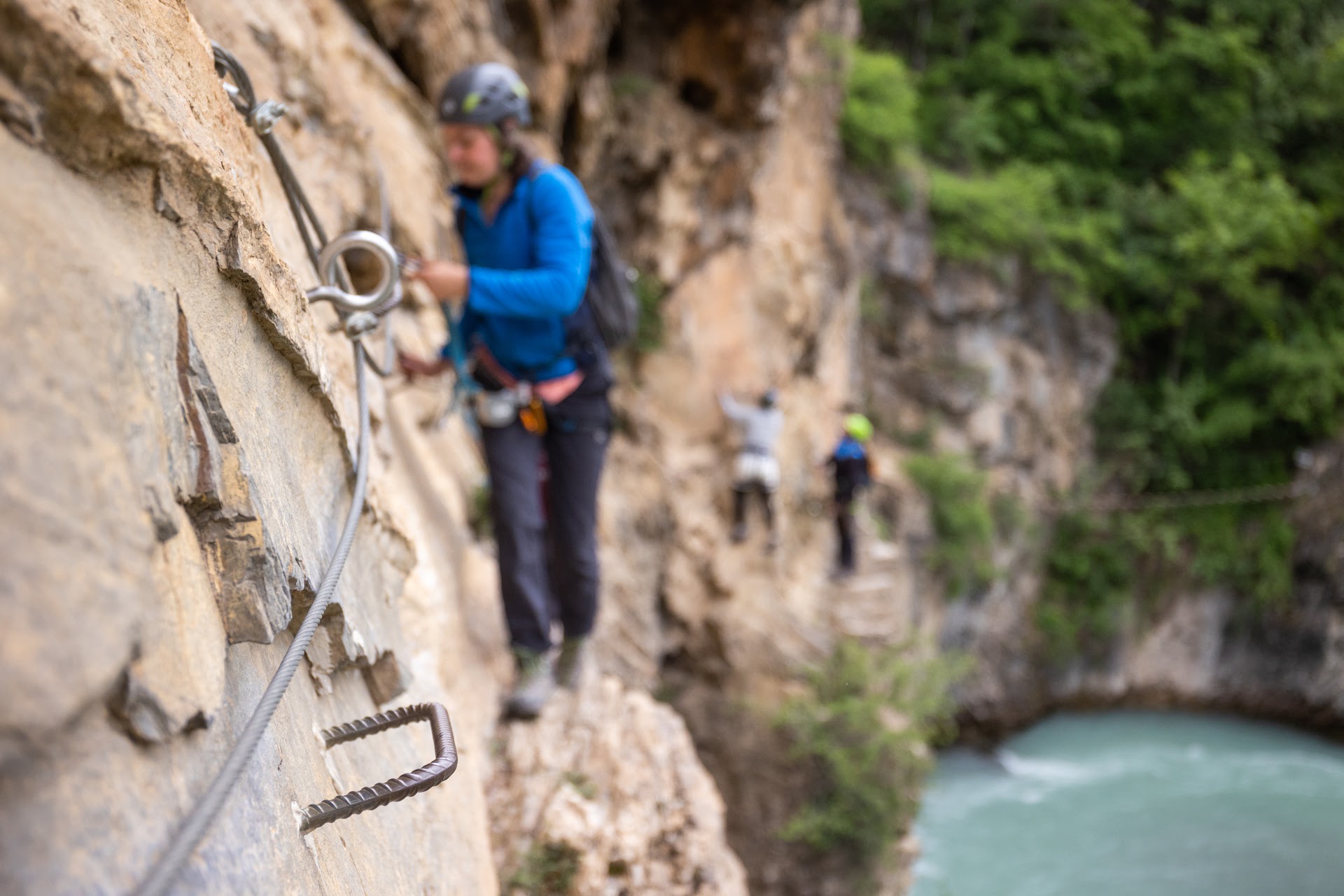 Une vire escarpée qui rejoint le lit de la rivière donne accès à la seconde partie de cette via ferrata. Commence alors une superbe ascension de 80 mètres.